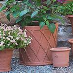 Crafted by hand in England, Whichford Pottery's Basket Barrel combines a traditional lattice motif with a contemporary silhouette to create a new icon. Superb indoors filled with foliage plants, and a natural for the porch or patio. We recommend the use of larger bark mulch or a wire mesh screen to cover the drainage hole.