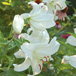 Lilies produce spectacular trumpet-shaped flowers atop strong stems that arise from bulbs made up of scale-like segments. Heights vary according to variety, ranging from 2 feet to 6 feet or so. All are elegant in the perennial border and shorter varieties may be successfully grown in pots. Those types close to the species are lovely for naturalizing. Lilies are indispensable for cutting, and a single stem in a vase makes a classic statement; remove stamens to avoid contact with the pollen, which may cause stubborn stains. Plant in an area sheltered from strong winds, and plan on staking the taller types.