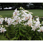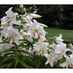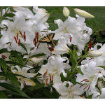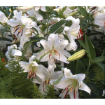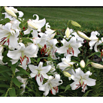 Even in a group noted for large flowers, vigorous growth, and sweet perfume, 'Casa Blanca' is a standout. The huge flowers are pure, gleaming white, delicately flocked in a way that adds richness and texture. When this Lily blooms in our Moon Garden, our staff find excuses to wander nearby, while visitors stand transfixed, lost in the perfume and admiring the hawkmoths that hover over the blooms day and evening. Adjectives like "astonishing" and "ravishing" may seem like catalog hyperbole, until you actually see one of these Lilies in bloom. Then words fail. 'Casa Blanca' is widely regarded by horticultural professionals as the best white Oriental Lily ever.