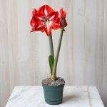 Please note: Some of our Amaryllis kits are shipped with a disk of potting medium (Cocopeat). Follow the directions on the package for rehydrating the disk. Fill the pot about 1/2 full with Cocopeat, set the bulb on top, and fill in around the bulb with additional Cocopeat. Adjust the position of the bulb as needed so that the top 1/3 of the bulb is exposed. Do not be concerned if the final level of the Cocopeat is down inside the pot. Firm the Cocopeat and water lightly to settle it around the bulb. Then follow the “Pre-bloom Care” instructions below.