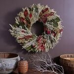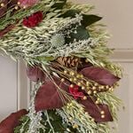 A warm autumn colorway of burgundy and forest green transitions beautifully into the holiday season and makes our exclusive and uncommon Burgundy Serenity Wreath a versatile ornament in any room. A ring of Avena Oats is studded with sprigs of preserved burgundy- and basil-colored Salal, wisps of dried Cedar, dainty Flax seed pods, fuzzy red Celosia, and cones from Douglas Fir with stems of dried gray Artemisia and spiky blue-hued Echinops adding surprise and contrasting color and form.