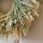 The beauty of an autumn meadow is captured in our exclusive Verdant Jubilee Wreath, a very full, rustic round that brings the warmth of the season to any interior or sheltered outdoor space. Composed in colors of pale green, ivory, and tan, the wreath features Wheat, Avena Oats, Feather Reed Grass, Ammobium Daisies, Flax, and Pycnanthemum (Mountain Mint).